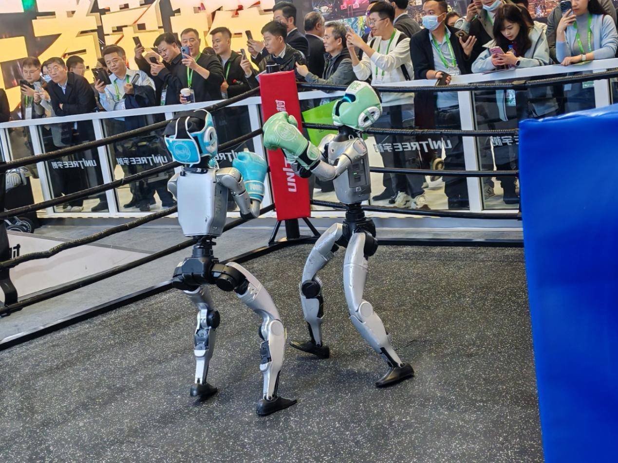 走进宇树科技展台,两个G1格斗款人形机器人正在热火朝地进行“拳击比赛”。该款机器人搭载了自主研发的全新高响应动态平衡算法与关节驱动技术,能够在高速对抗中保持极致的运动稳定性。现场,G1不仅流畅演示了直拳、勾拳、侧踢等专业格斗动作,更在受到外力冲击时展现出卓越的自主平衡恢复能力,即使意外摔倒也能在数秒内迅速起身,重新投入“战斗”,其拟人化的敏捷身手与稳定表现,赢得了现场观众的阵阵掌声。
