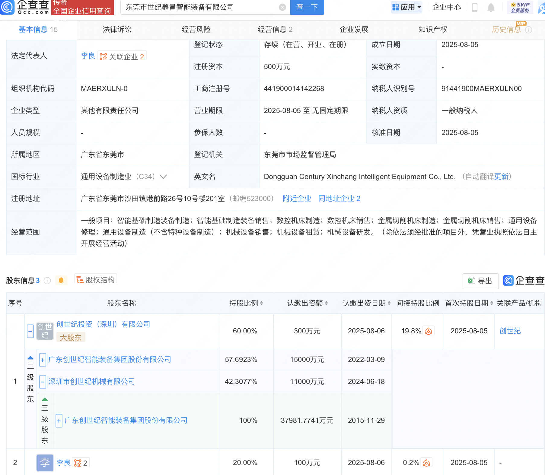 近日,东莞市世纪鑫昌智能装备有限公司成立,法定代表人为李良,经营范围包含:智能基础制造装备制造;智能基础制造装备销售;数控机床制造等。企查查股权穿透显示,该公司由创世纪(300083)旗下创世纪投资(深圳)有限公司等共同持股。